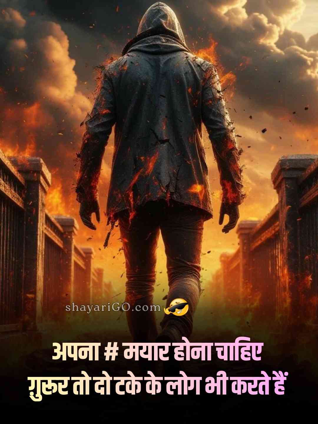 सिर्फ दो पंक्तियों में, यह शायरी व्यक्ति के व्यक्तित्व की झलक और उसके रवैये की मजबूती को बखूबी दर्शाती है।